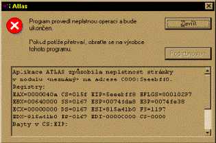 ŘEŠENÍ PROBLÉMŮ - ATLAS SVĚTA 1) Ochrana proti kopírování Program Atlas světa je chráněn proti nelegálnímu kopírování. Speciální kontrolní funkce ověřují při každém spuštění, zda máte legální kopii programu. Proto se před každým spuštěním programu přesvědčte, že máte CD disk Atlas světa vložený v CD-ROM mechanice. Jestliže jej zapomenete do mechaniky dát, spouštěný program po chvíli váhání nahlásí chybu a nekorektně se ukončí. 2) Chybová hláška "Program provedl neplatnou operaci" Zobrazí-li se na Vašem počítači následující chybové hlášení Windows (Aplikace ATLAS způsobila neplatnost stránky v modulu <neznámý> na adrese 0000:5eeebff8. Registry: EAX=0000040a ...) ![]() nahraďte soubor "Nomouse.pif" umístěný v adresáři C:\Jimaz\Atlas (resp. Vámi zvoleném adresáři) jeho novou verzí obsaženou v zip archívu Nomouse.zip 3) Problémy s tiskem textových informací nebo hlášení 0028:C00000A Pokud máte problémy při tisku textových informací (např. zajímavá místa, statistické přehledy států), některé české znaky se vytisknou chybně postupujte dle následujícího návodu. Stejný postup použijte i v případě, že se na Vašem počítači při spuštění Atlasu světa objeví následující chybové hlášení (chyba na adrese 0028:C00000A) ![]() Postup: a) Downloadujte následující "samorozbalovací zip archív" Atlas2.exe (272 kB) s novou verzí souborů Atlasu světa. b) Pokud používáte Atlas světa pouze z CD (při instalaci jste odoznačili první a druhou přednastavenou volbu rozsahu instalace), reinstalujte Atlas světa tak, že zaškrtnuta zůstane minimálně první volba obrazovky "Rozsah instalace" - tj. program, knihovny, nápověda a dokončete instalaci. c) Při instalaci je přednastavena cesta umístění souborů Atlasu světa na hardisk na C:\Jimaz\Atlas , pokud jste umístění zvolili vlastní, zkontrolujte zda Vámi zvolený adresář obsahuje soubor "Atlas.exe". d) Spusťte downloadovaný archív "Atlas.exe" s novými verzemi souborů Atlasu světa. Přednastavená cesta rozbalení souborů je C:\Jimaz\Atlas , pokud jste Atlas světa instalovali do jiného adresáře, nastavte Vámi zvolený adresář. Klikněte na volbu "UNZIP". Program přepíše stávající soubory: Atlaslib.dll, Atlas.exe, Nomouse.sp, Nomouse.pif, Nomouse.com jejich novými verzemi. Důležitá poznámka: Je třeba umožnit nahrazení všech výše uvedených souborů !!! 3) Antivirový program AVAST Rezidentní antivirová ochrana programu AVAST (od verze AVAST32 3.0 MAR 2001 je tento problém vyřešen) se snaží analyzovat softwarovou část ochrany CD proti nelegálnímu kopírování, která se z důvodu vlastní bezpečnosti brání a dojde tak k dočasnému narušení stability systému Windows). Možná řešení problému jsou: a) Pokud používáte verzi AVAST32 3.0 (vydanou do 2/2001) stáhněte si ze stránek firmy ALWIL www.asw.cz aktuální verzi programu AVAST32. Po nainstalování nové verze bude konflikt s ochranou CD vyřešen. b) Pokud Vám nevyhovuje řešení popsané ve variantě a/, nezbývá než před spuštěním multimediálního CD vypnout rezidentní antivirovou ochranu AVAST (resp. zakázat její spouštění při zavádění operačního systému) a RESTARTOVAT počítač (restart počítače je NEZBYTNÝ).